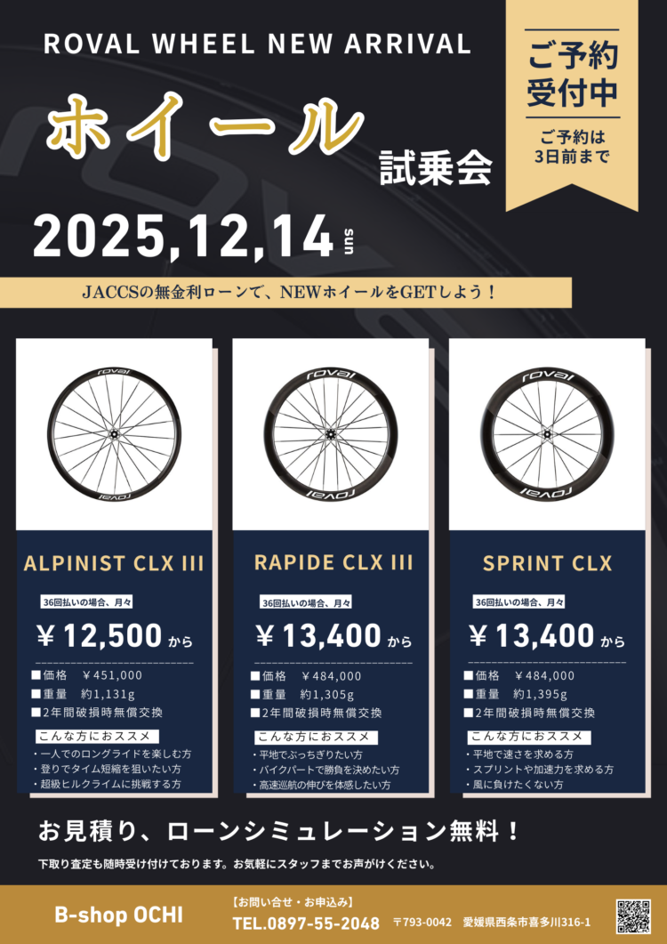 現在、ショップでは試乗ホイールとして3本ともご用意しております!