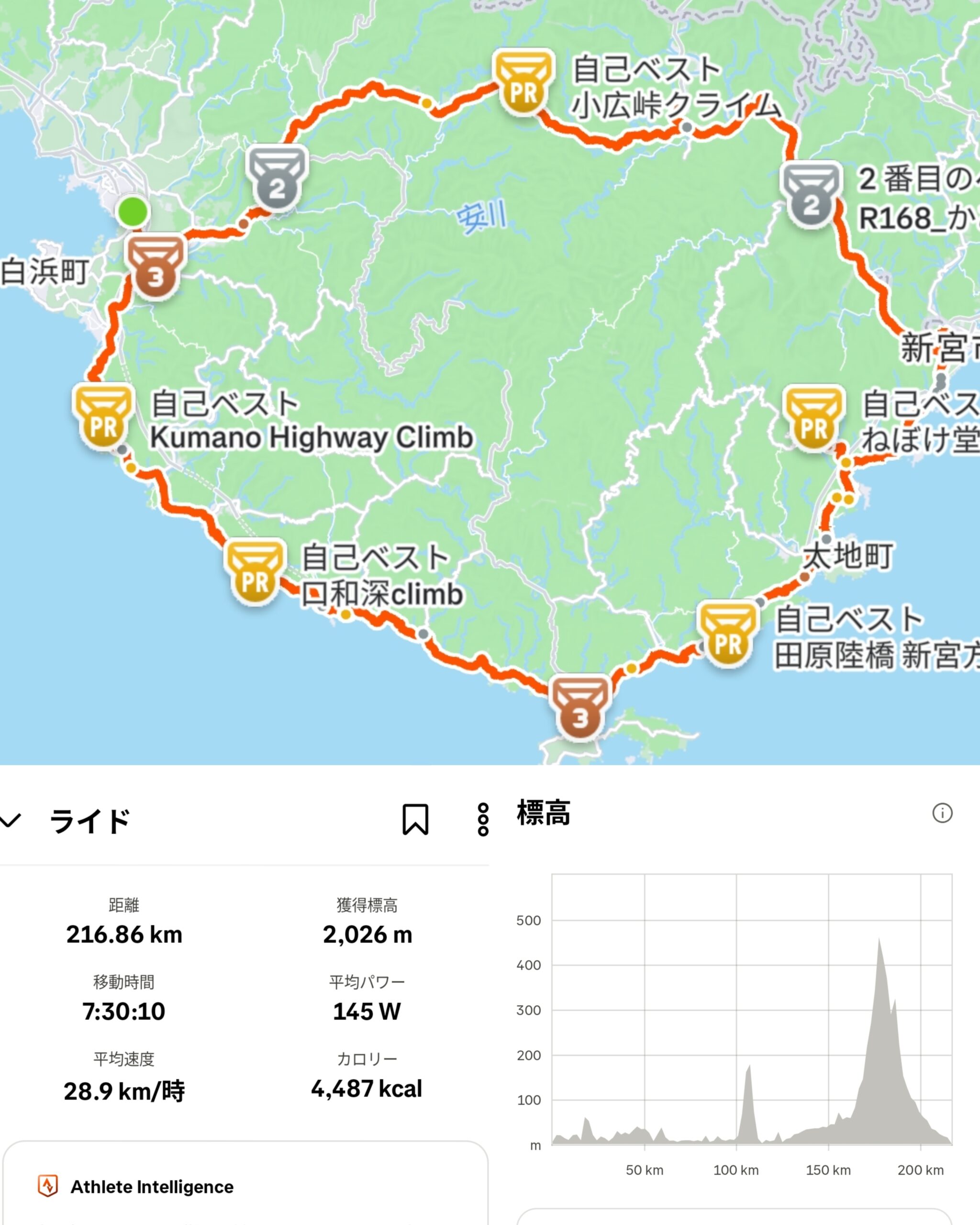 スタート〜那智大社: 小刻みなアップダウンが続く海岸線 + 那智へのヒルクライム
